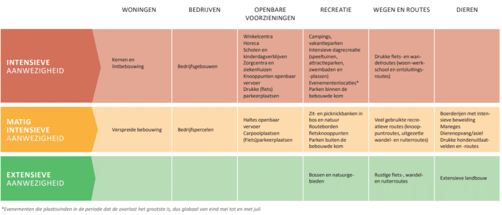Voor elke wijk of laan in je gemeente, bepaal je met behulp van de volgende tabel hoe intensief de aanwezigheid is van mensen en/of dieren: