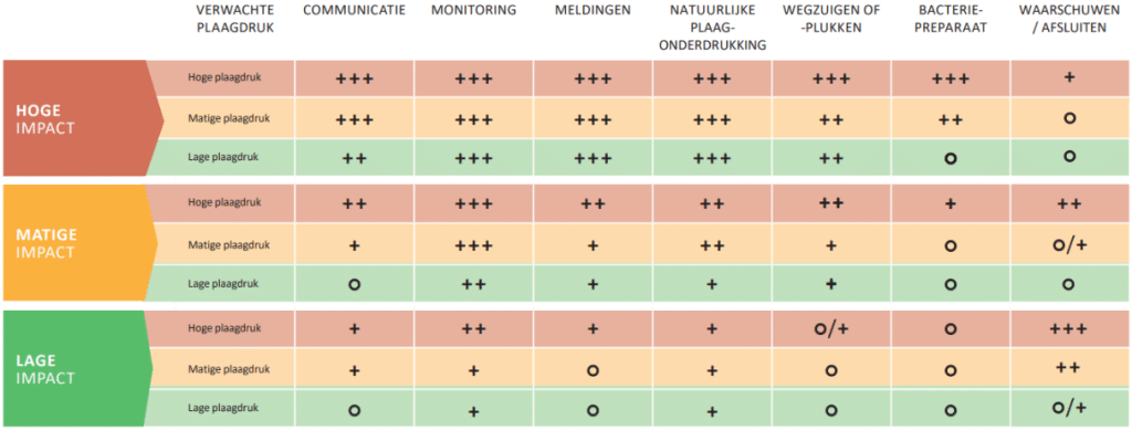 Nu je bepaald hebt of de rups een hoge, matige of lage impact heeft in een gebied, vind je in volgend schema en op deze pagina welke acties je bij voorkeur onderneemt.