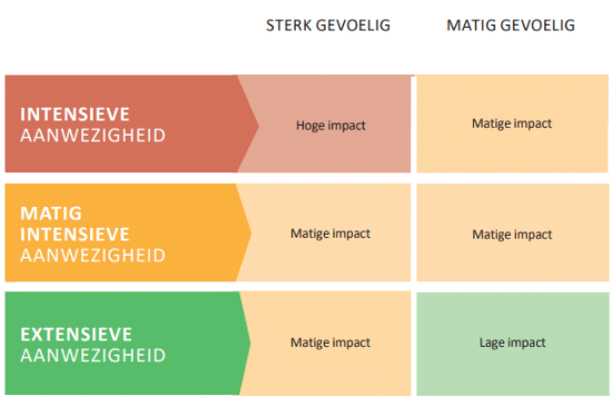 De combinatie van de intensiteit van menselijke aanwezigheid en de plaaggevoeligheid van de omgeving geeft als resultaat de impact op een bepaalde locatie en dus ook de prioriteit om de eikenprocessierups er te beheersen.